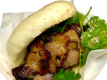 Pork belly braised with Asian spices and soy sauce for hours, garnished with ground peanuts*, habanero sweet & sour greens, and cilantro, all stuffed in a heavenly soft handmade bao!